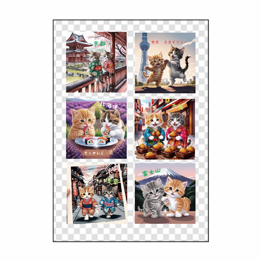 cavaAIでデザインしたものです。可愛い猫ちゃんが日本の有名観光地を両行している様子です。
